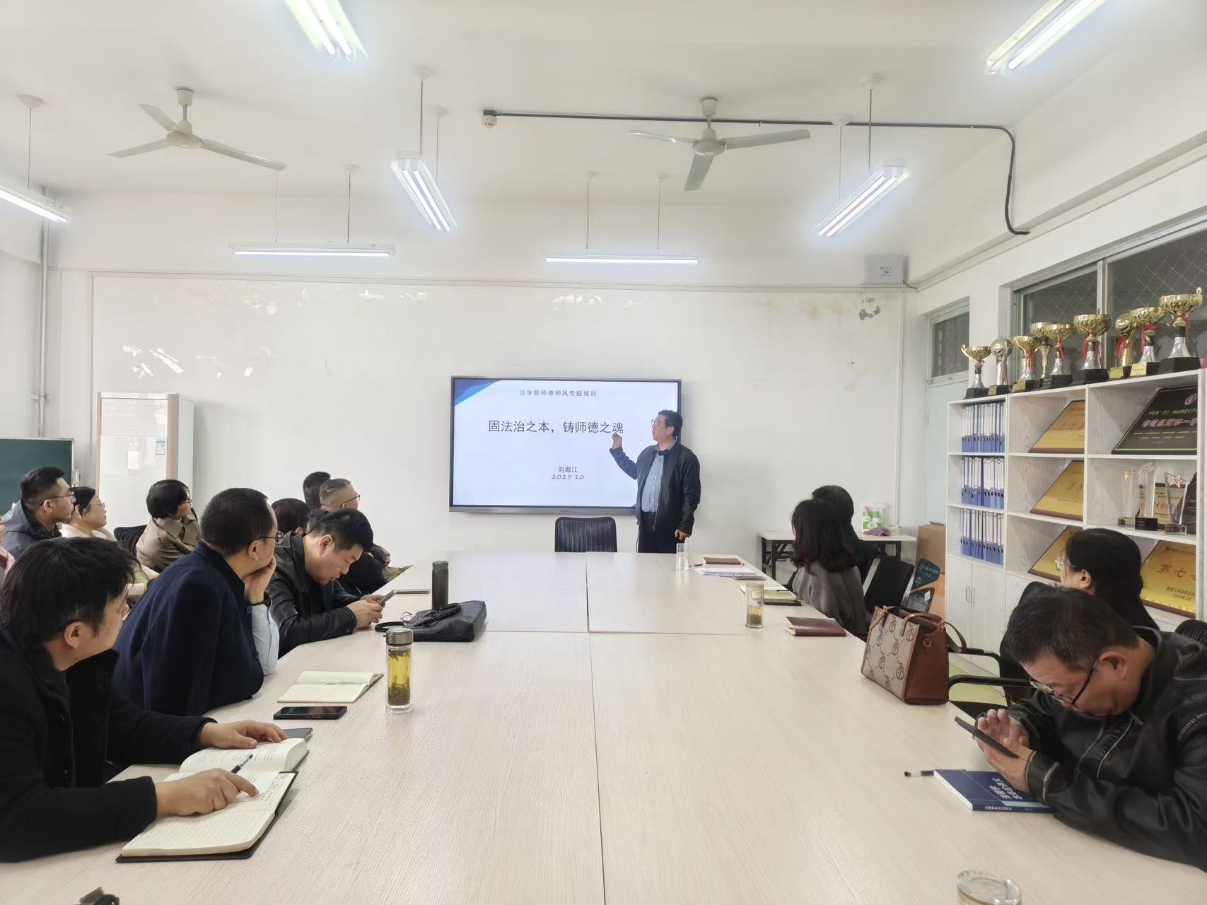 为切实加强学院师德师风建设,提升教师职业道德素养与育人能力,近日,按照bbin游戏娱乐官网师德建设教育宣传月的要求,bbin游戏娱乐官网在会议室举办了的师德师风专题讲座,学院副院长刘海江教授做了题为《固法治之本,铸师德之魂》的报告,全体教工参加了此次讲座。