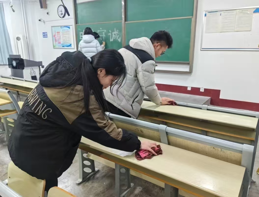 活动现场,同学们分工明确、配合默契,对教室进行全面复检与深度清理,仔细擦拭课桌桌面及桌椅,清除残留杂物与字迹;对黑板、讲台、窗台等区域进行二次清洁,不放过任何一处卫生死角,确保教室每一个角落都窗明几净。